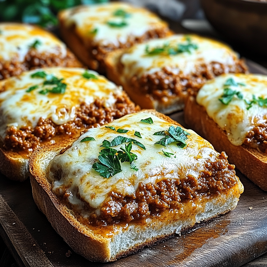 The recipe features ground beef cooked with savory seasonings, layered between slices of cheesy garlic bread, baked until melty and golden.