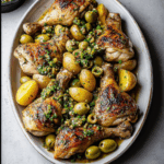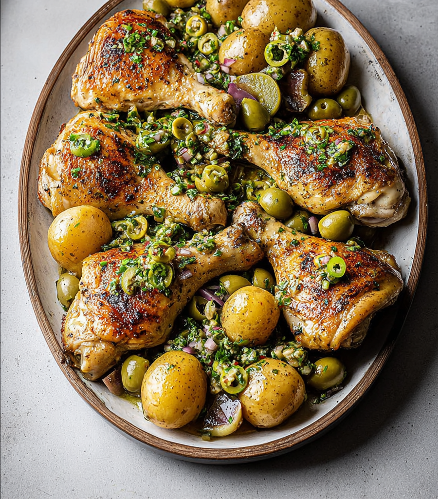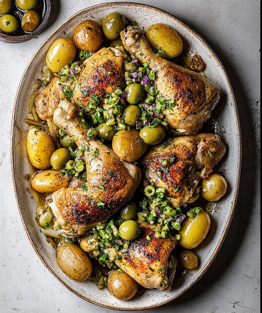 Enjoy a delicious and satisfying Sheet Pan Chicken and Potatoes with Green Olive Salsa Delight, perfect for family dinners or entertaining guests. This dish combines tender chicken legs with golden potatoes, all roasted to perfection and topped with a fresh, zesty green olive salsa. It’s a one-pan meal that delivers Mediterranean flavors while being easy to prepare and clean up.